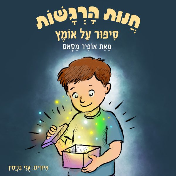 ואז הוא גילה אותה: חנות קטנה ומוזרה בקצה החצר, מלאה בקופסאות צבעוניות עם שמות של רגשות – פחד, שמחה, עצב וגם אומץ.